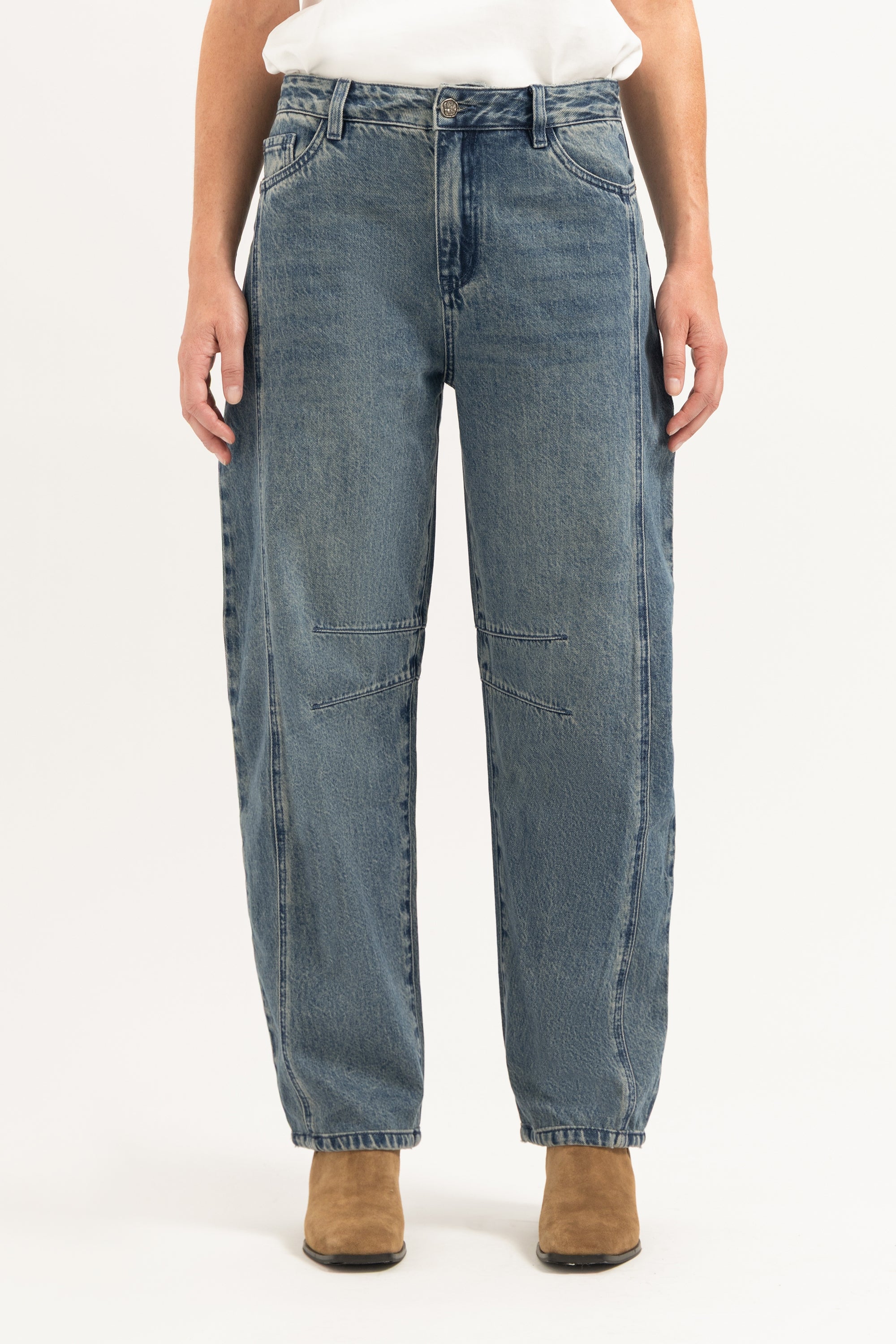 De Simmy is een barrel jeans met ballonvormige broekspijpen. De subtiele, maar opvallende naden geven de broek een speelse twist. Deze jeans heeft een 5-pocket design en heeft en een elegante lichte wassing. Verkrijgbaar in meerdere kleuren.